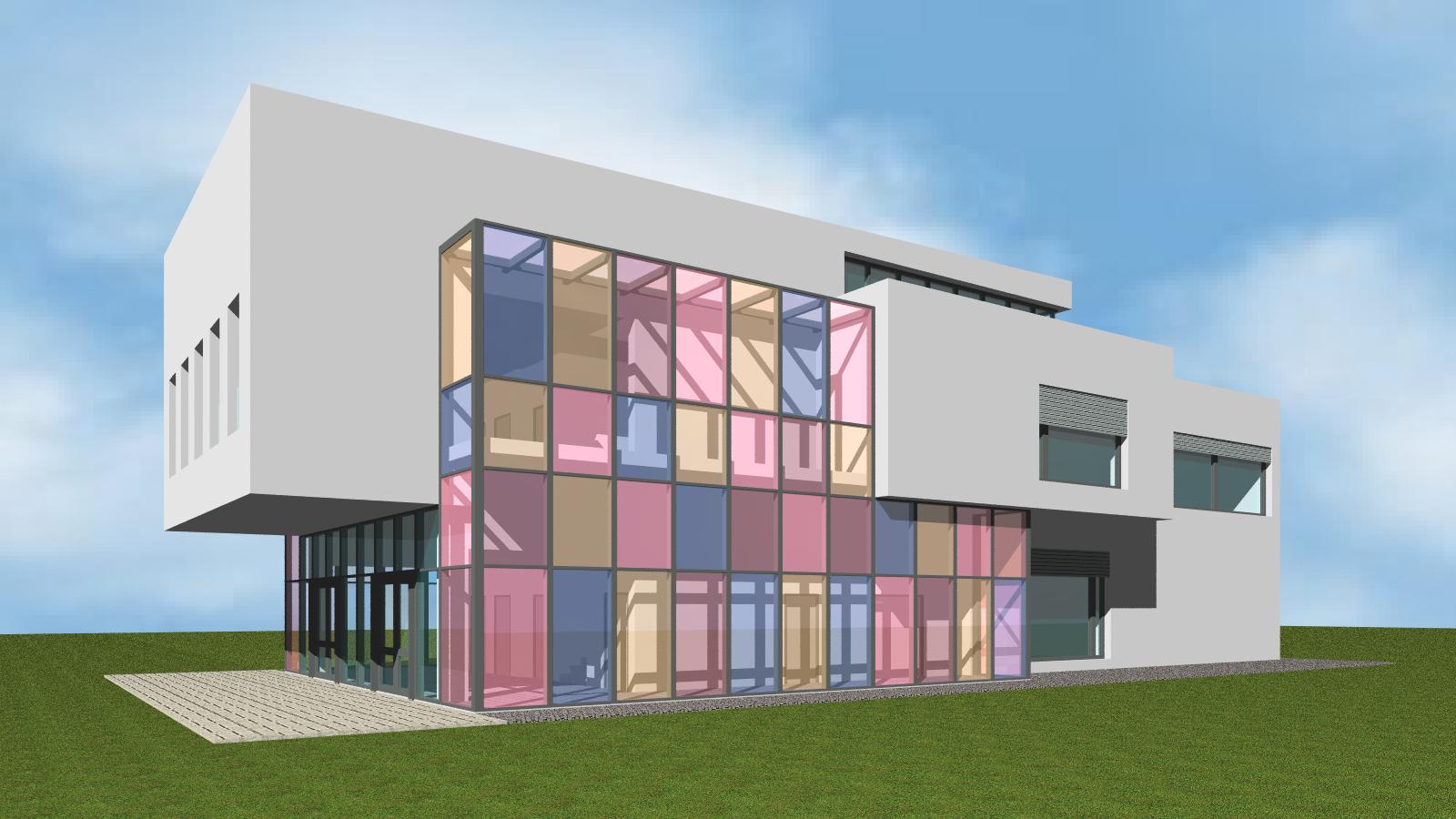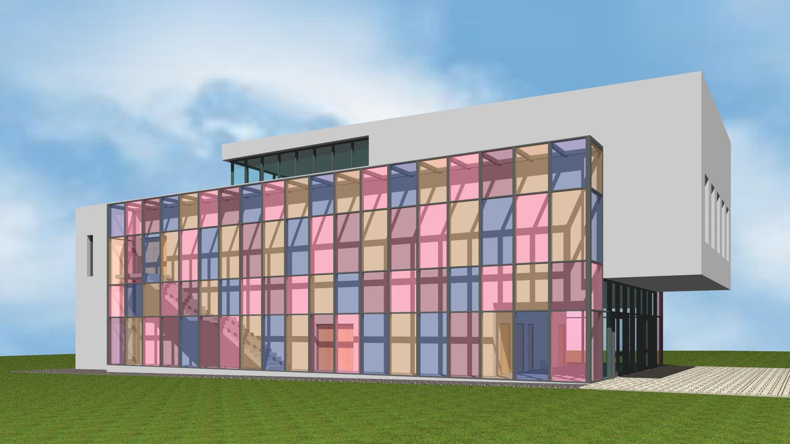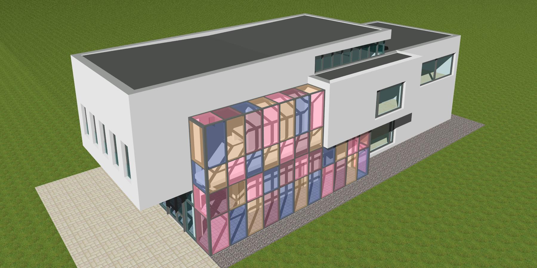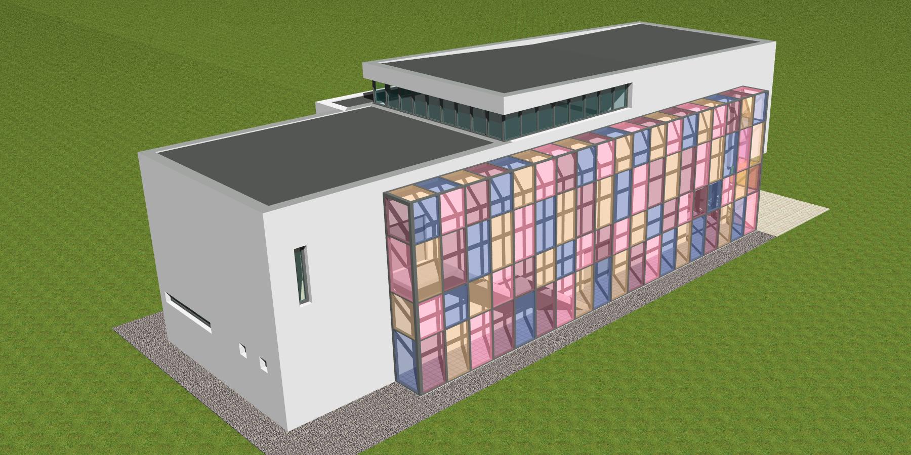Soutěžní návrh dostavby základní umělecké školy v Úpici. Nový pavilon pro obor hudební, výtvarný a taneční včetně malého koncertního sálu.